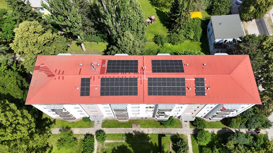 Foto: Realizace FVE pro bytový dům v Olomouci. Instalovaný výkon: 31,28 kWp, kapacita baterie: 34,8 kWh, návratnost investice 6,6 roku.