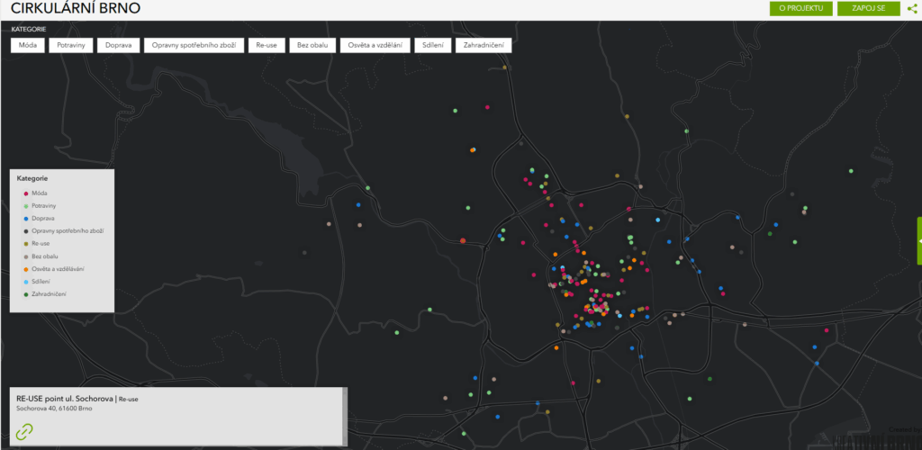 Abychom vám zapojení usnadnili, můžete si na Mapě Cirkulární Brno najít místní designéry, prodejce lokálních potravin, bezobalové obchody, re-use centra, bazary, opravny, vzdělávací instituce, stanice sdílených dopravních prostředků a mnohé další. Mapa Cirkulární Brno je zaměřená na velmi aktuální téma cirkulární ekonomiky a vznikla proto, aby obyvatelům města pomohla chovat se při svých nákupech více udržitelně a volit produkty a služby, které mají co nejmenší negativní dopad na životní prostředí.