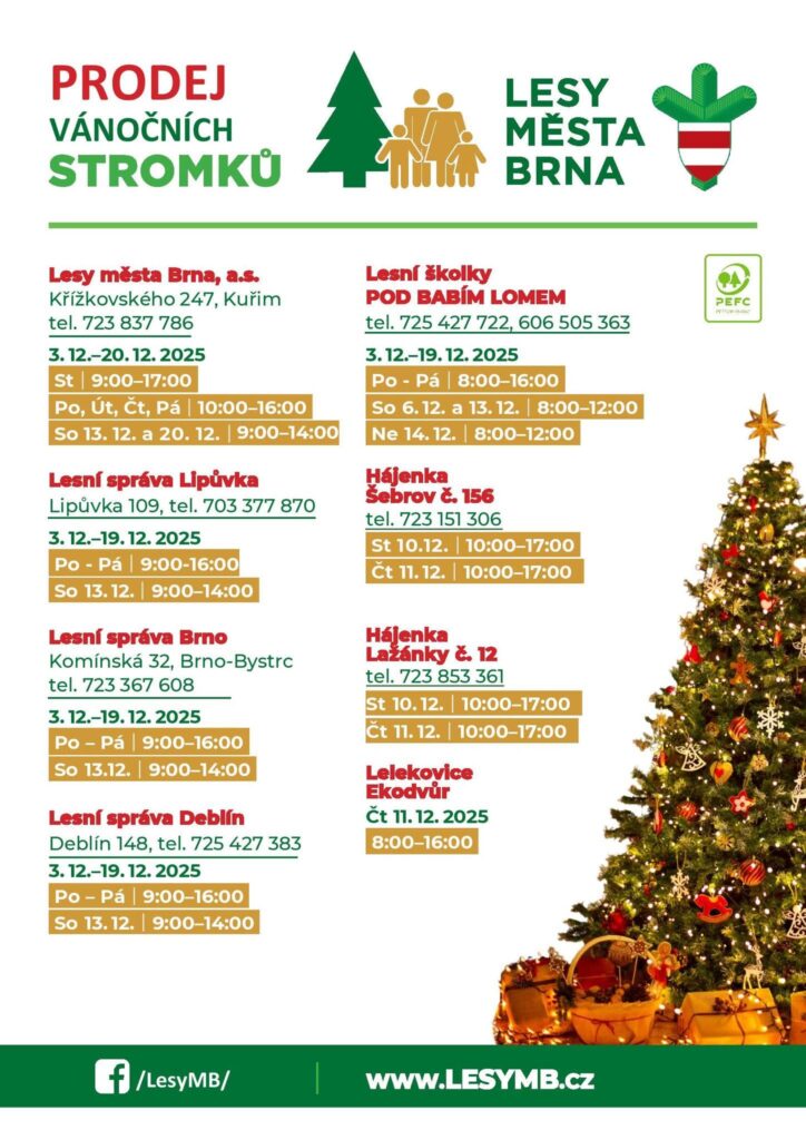 Od začátku prosince jsou pro vás připravené vánoční řezané stromky i stromky v květináči od Lesů města Brna, které pocházejí z plantáží určených přímo pro vánoční období nebo z šetrných prořezávek. Přijďte si vybrat svůj vánoční stromek v klidu a bez stresu. V Brně můžete zavítat do Bystrce, na Lesní správu Brno, Komínská 32 v pracovní dny od 9 do 16 hodin nebo v sobotu 13.12. od 9 do 14 hodin.