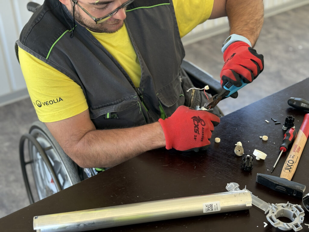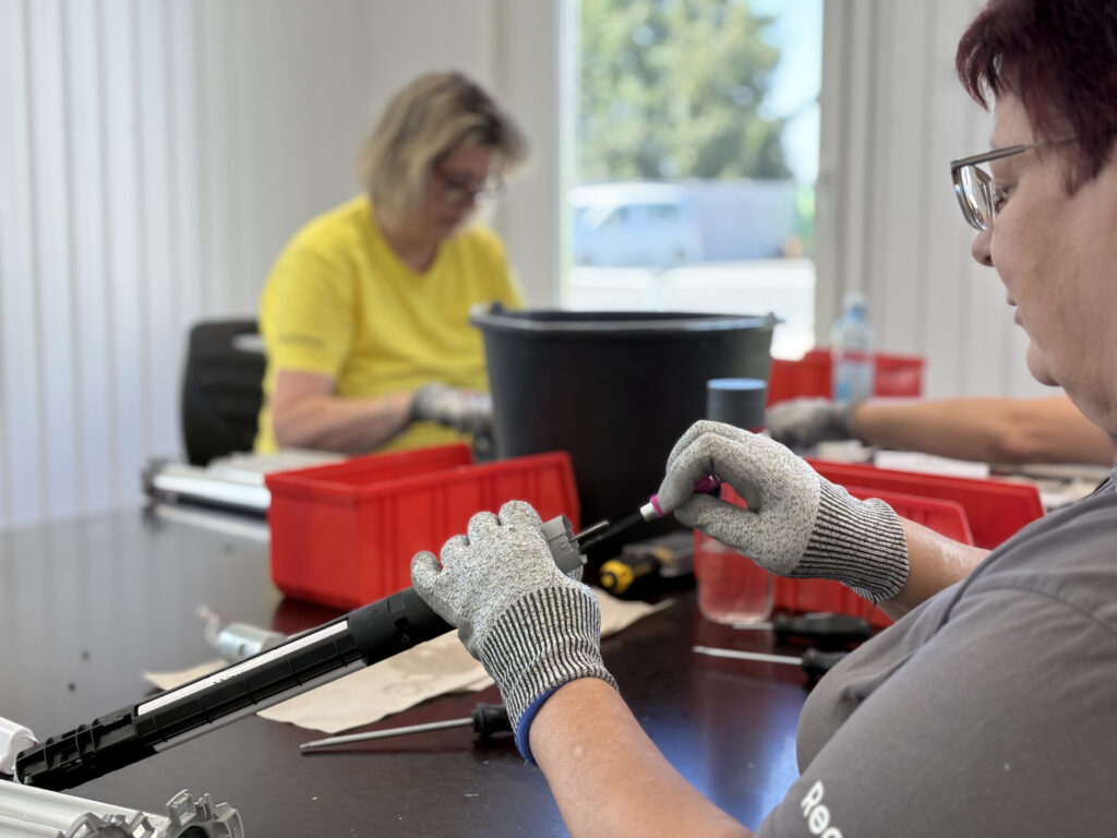 Hlavní náplní dílny je separace průmyslových materiálů. Jde o činnost, na kterou jsou automatizované linky krátké – vyžaduje totiž trpělivost a lidský cit. Zaměstnanci zde rozebírají složité komponenty, jako jsou plastové díly s kovovými prvky či silikonem, a připravují je k další recyklaci.